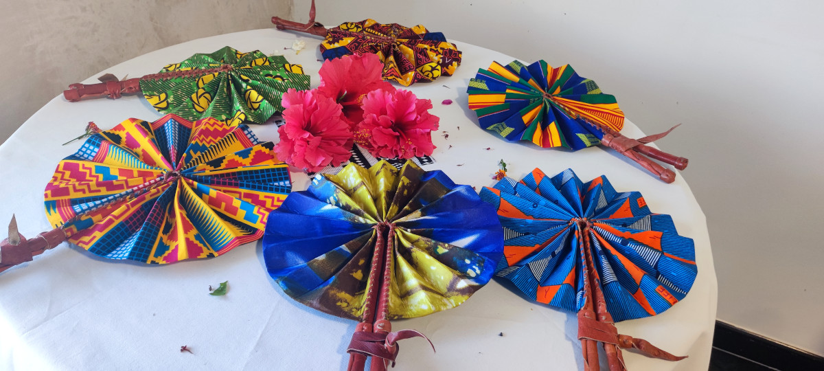 Abanico Nomad. Wax. Cuero. Abanico africano hecho con tejido wax y cuero muy ligero que se puede usar en cualquier lugar. Llevas este abanico africano y estarás a la moda africana. Abanico Cerrado 19x19cm. Abanico abierto: 24x32cm. Origen Senegal.