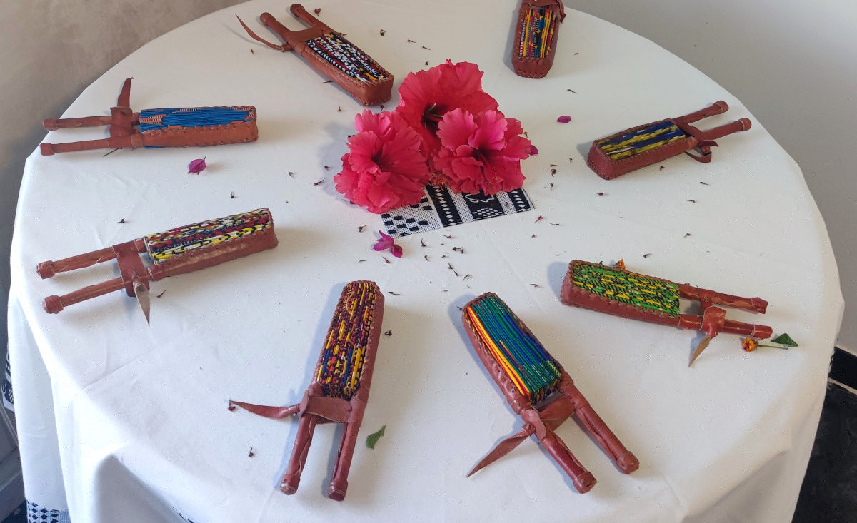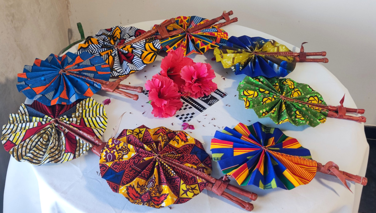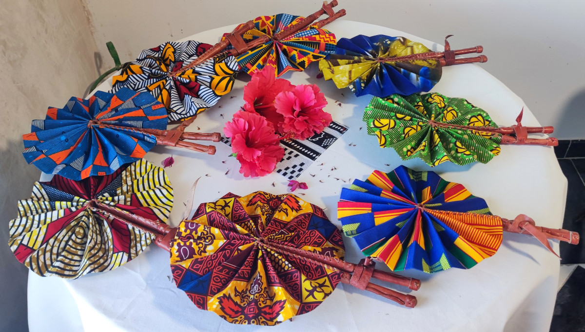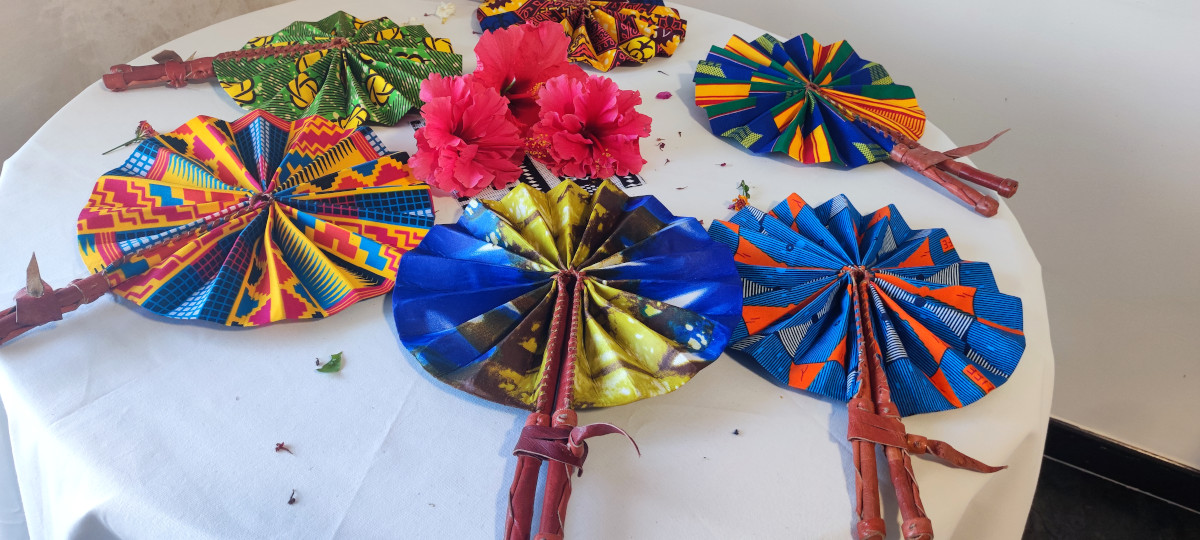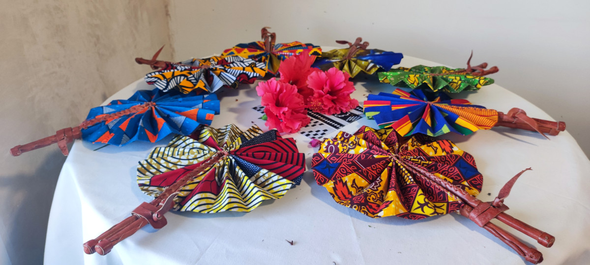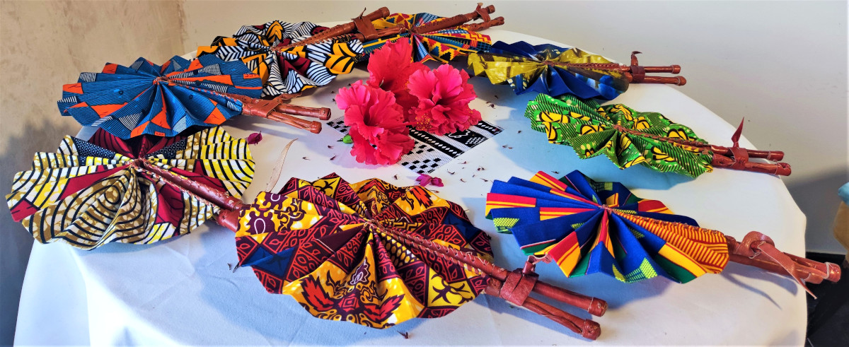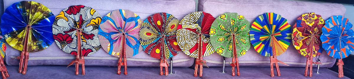 Abanico Oasis. Wax. Cuero. Abanico africano hecho con tejido wax y cuero muy ligero que se puede usar en cualquier lugar. Llevas este abanico africano y estás a la moda africana. Abanico Cerrado 19x19cm. Abanico abierto: 24x32cm. Origen Senegal.